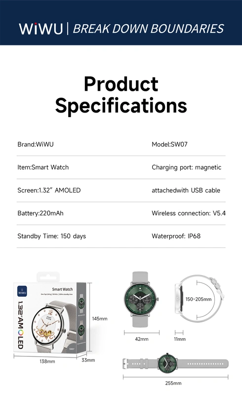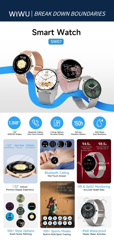 Compact and stylish smartwatch with a 1.32″ AMOLED HD display, Bluetooth calling, red-light SpO₂ detection, heart-rate monitoring, multiple sports modes, and 1 Year Warranty.